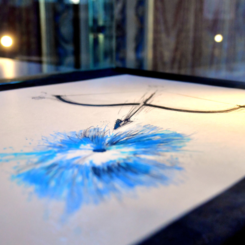 A conclusione simbolica dell’intero progetto, è stata esposta nella Loggia di Galatea l’opera di Fabrizio Plessi Bucare il mare, un trittico di suoi disegni. La straordinaria capacità dell’artista di inserirsi in contesti di grande rilevanza e tradizione storico-artistica permette che i suoi disegni siano in grado di dialogare con i grandi cicli pittorici con intensità e, allo stesso tempo, con grande discrezione. L’esposizione si è posta quindi come indagine sul funzionamento del pensiero creativo, in cui il disegno rappresenta lo scheletro costitutivo dell’opera dell’artista.