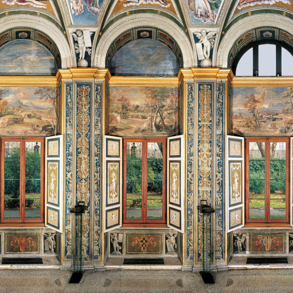 Il restauro dei cinque paesaggi della parete nord e della parete ovest della Loggia di Galatea sono stati eseguiti nel 2019 grazie al sostegno del Socio Linceo Prof. Natalino Irti a cura di Giovanna Antonelli, Maria Rosaria Basileo, Giorgia Galanti (Coop. Fabrica Conservazione e Restauro) – ATI.