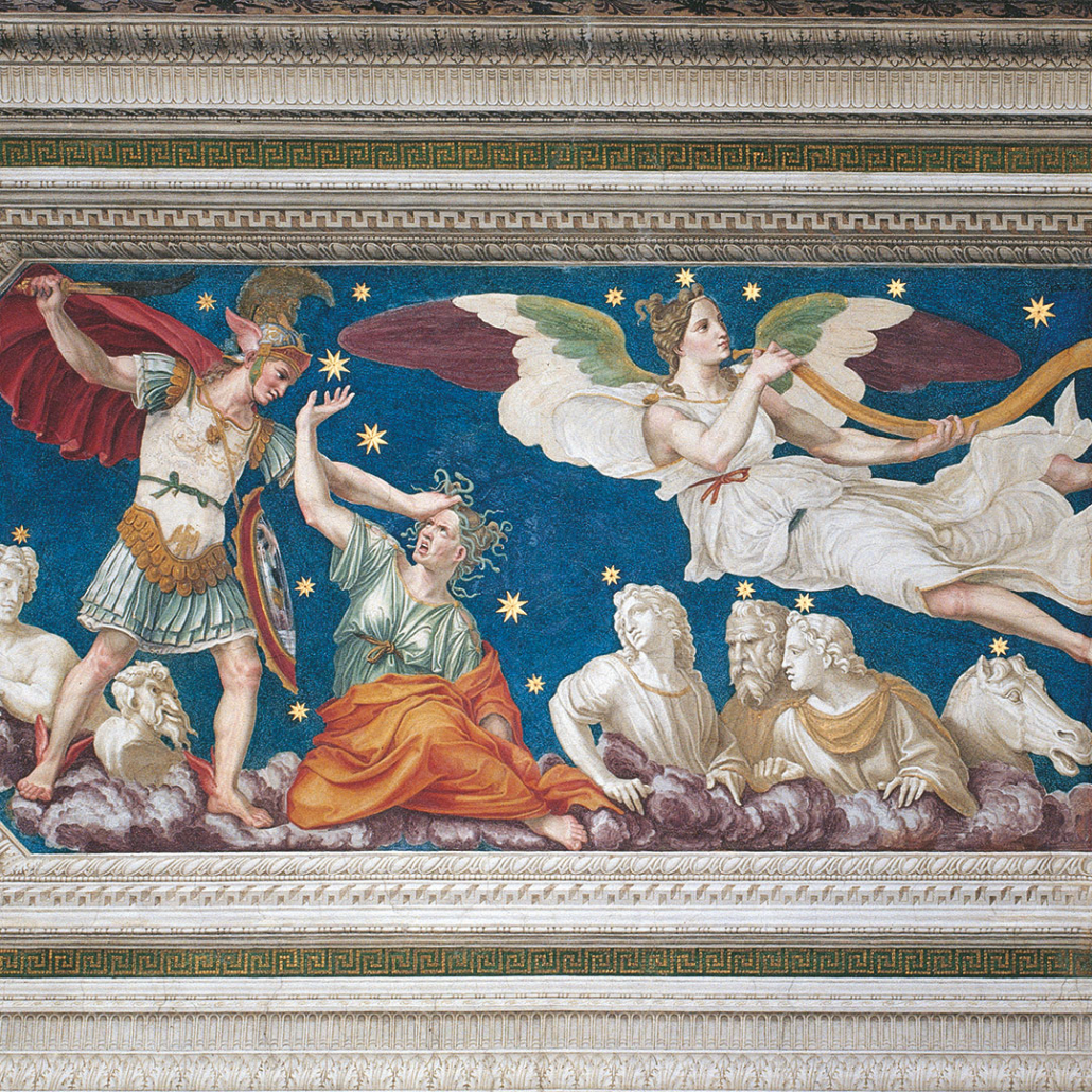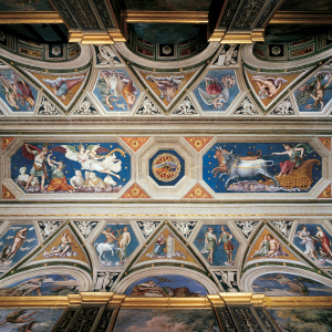La Loggia fu affrescata da diversi artisti. Il primo fu Baldassarre Peruzzi, che nel 1511 affrescò sulla volta l’oroscopo di Agostino Chigi.