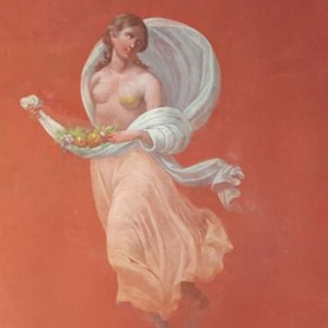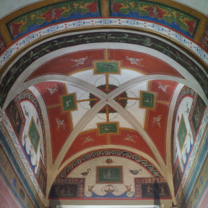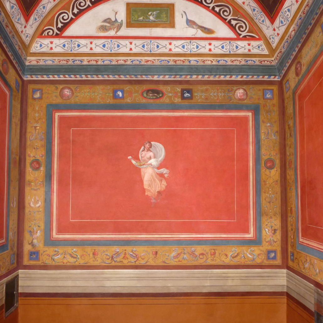 Da qui, dopo i recenti restauri, si accede alla zona sud-ovest del piano terra della Villa che faceva parte dell’area privata di Agostino Chigi.
