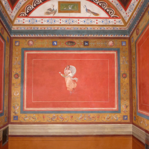 Nel Cinquecento la Saletta pompeiana costituiva il pianerottolo per la rampa di collegamento con le cucine al livello seminterrato mentre nell’Ottocento Salvador Bermúdez de Castro fece rimuovere la scala per erigere l’attuale parete est rendendo l’ambiente un disimpegno.